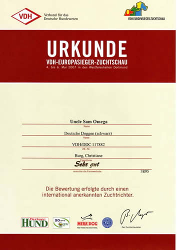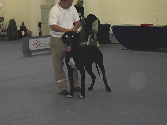 Ein sehr leichter eleganter Rüde,der Kopf zum Gebäude passend,Korrektes Scherengebiss, Lidschluss nicht ganz fest,langer trockener Hals,fest in der Rückenlinie,dieBrust etwas knapp in der Tiefe,in der Vorhand etwas steil gewinkelt,in der Hinterhand Korrekt,freies Gangwerk